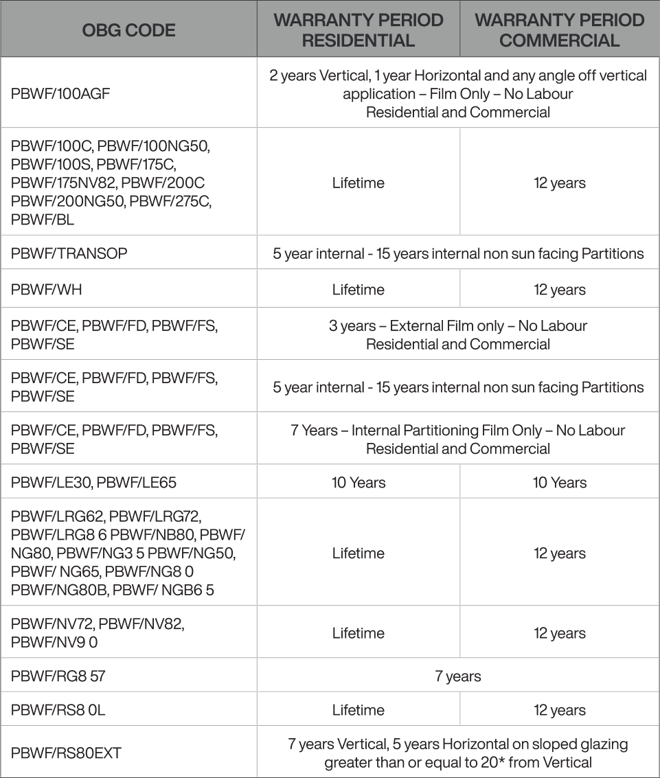 The warranty period commences from the date of installation and varies depending on the film and whether it is used for residential or commercial purposes. Please refer to the Warranty Table.